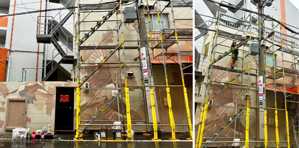 彼はミューラルを描くために世界中をまわっていて、今回は日本で描くチャンスを得て、「羽ばたく百舌鳥」を壁一面に描いてました。大阪府のご当地キャラクターもずやんからインスピレーションを受けてそうです!